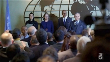 Pressekonfereunz der UN verkündet Präsident Suvarov,
